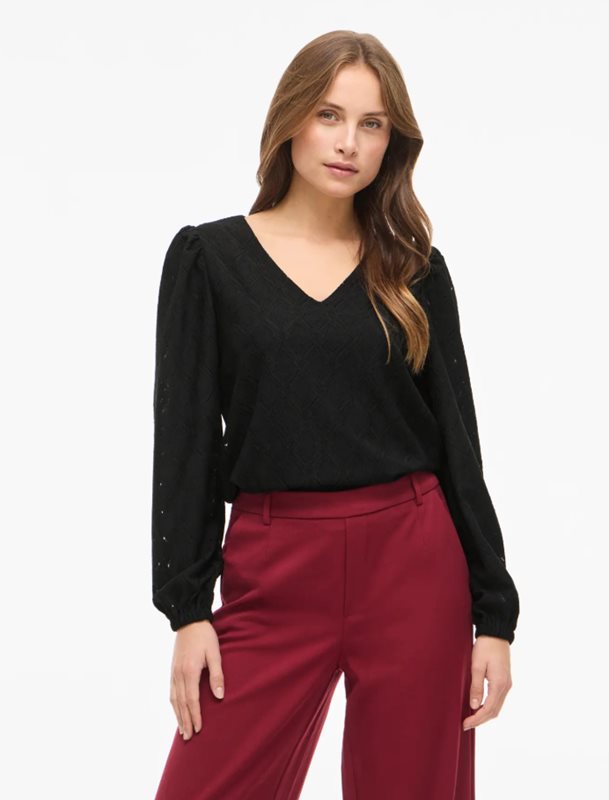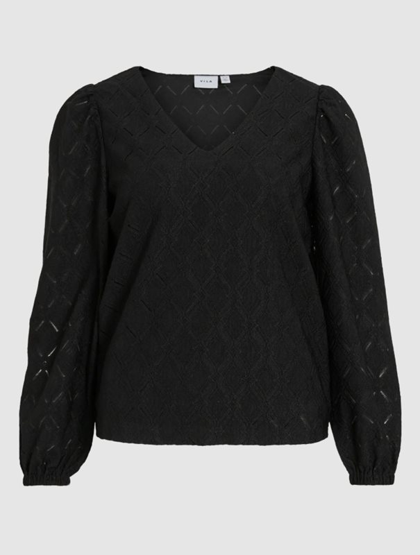 En elegant topp från Vila med v-ringning och vackert strukturmönstrat tyg. VIFero-toppen har långa, lätt puffade ärmar med resår i ärmsluten och en feminin silhuett som passar både till vardags och fest. Det återvunna materialet gör den till ett hållbart val utan att kompromissa med stilen.