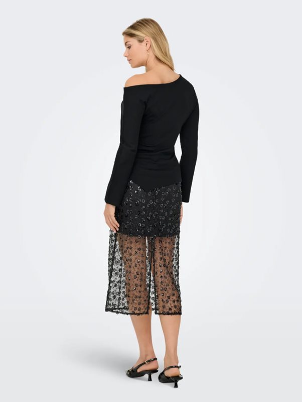 Elegant och trendig topp från JDY med en asymmetrisk design som ger en modern och sofistikerad look. Toppen har en mjuk och följsam passform med långa ärmar och en lätt snedskuren halsringning som kan bäras off shoulder för en stilfull touch. Den spetsiga nederkanten framtill ger ett smickrande intryck och gör den enkel att styla både till vardags och fest.