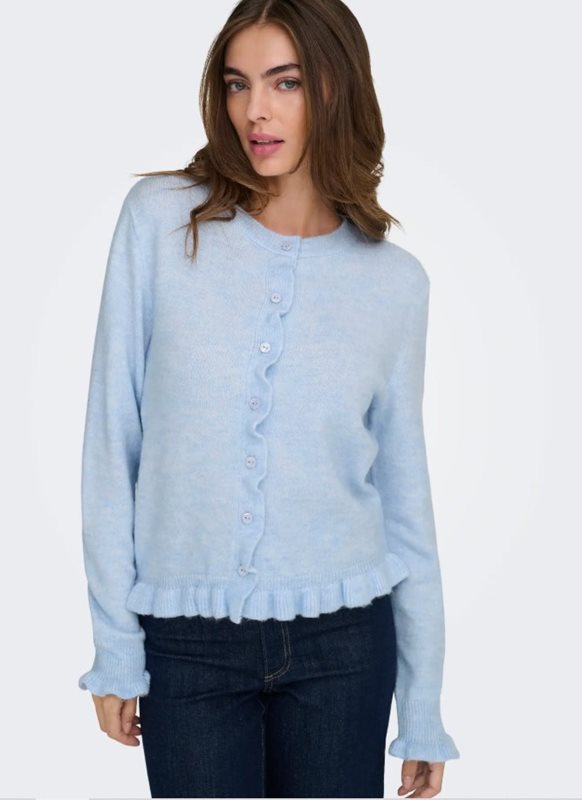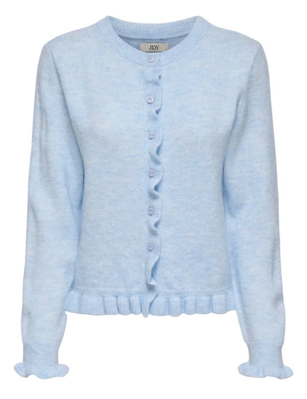 En söt och feminin cardigan från JDY med volangdetaljer längs knappslån, ärmsluten och nederkanten. Den har rund halsringning och en mjuk, borstad struktur som gör den både mysig och stilfull.
