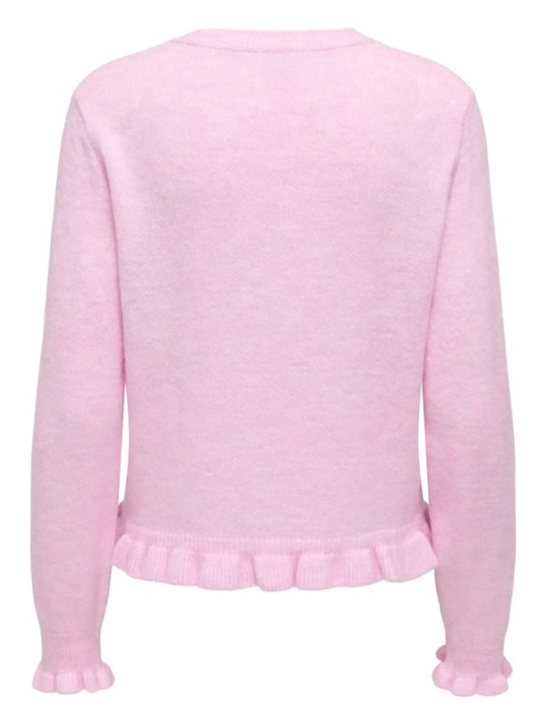 En söt och feminin cardigan från JDY med volangdetaljer längs knappslån, ärmsluten och nederkanten. Den har rund halsringning och en mjuk, borstad struktur som gör den både mysig och stilfull.