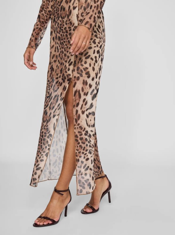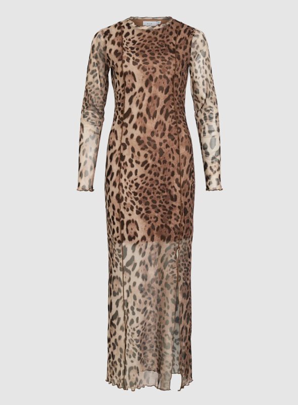 En figurnära klänning i mesh med ett uttrycksfullt mönster och modern silhuett. VININNA har långa ärmar, rund halsringning och en slits framtill som ger en elegant och sofistikerad känsla. Den tunna, stretchiga meshkvaliteten gör klänningen både bekväm och följsam – perfekt för både fest och middagskvällar.