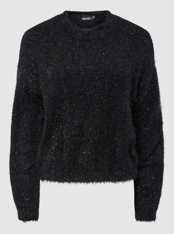 En stickad tröja med en mjuk, fluffig struktur och subtil glans som ger ett elegant uttryck. PCMIE har en klassisk rund halsringning och en rak passform som gör den lätt att styla både till vardags och festligare tillfällen. Den skimrande effekten i garnet lyfter looken utan att ta över, och materialet är följsamt med en behaglig känsla mot huden.